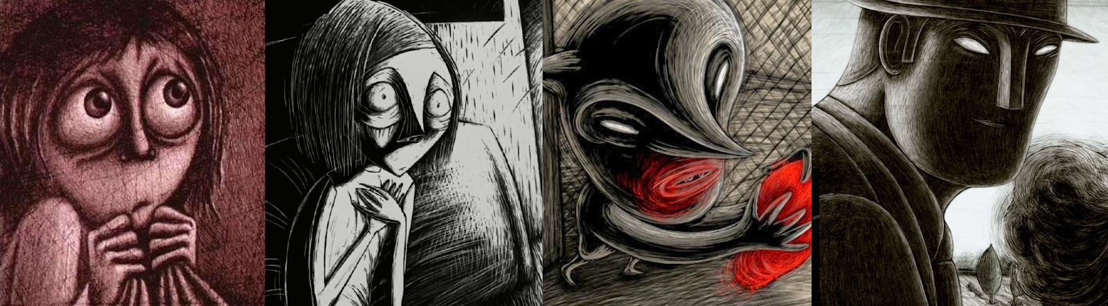 Personagens dos 4 filmes de Regina Pessoa, da esquerda para a direita: “A Noite”; “História Trágica com Final Feliz”; “Kali, o Pequeno Vampiro”; “Tio Tomás, a contabilidade dos dias”